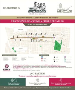 Morelia, Michoacán, 19 de noviembre de 2025.— La Secretaría de Seguridad Pública (SSP) informó que a partir de las 00:01 horas del jueves 20 de noviembre comenzarán los cierres vehiculares en el Centro Histórico por el desfile del 115 Aniversario de la Revolución Mexicana.