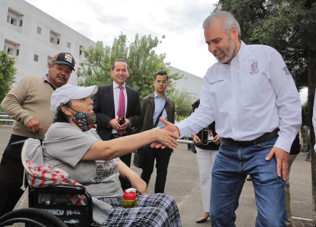 Morelia, Michoacán, 7 de julio de 2023.– El gobernador Alfredo Ramírez Bedolla, señaló que se trabaja de manera coordinada con la Federación a fin de fortalecer el sistema de salud en el estado, con la remodelación de tres hospitales de la entidad, así como la adquisición de equipo médico para pacientes con cáncer.