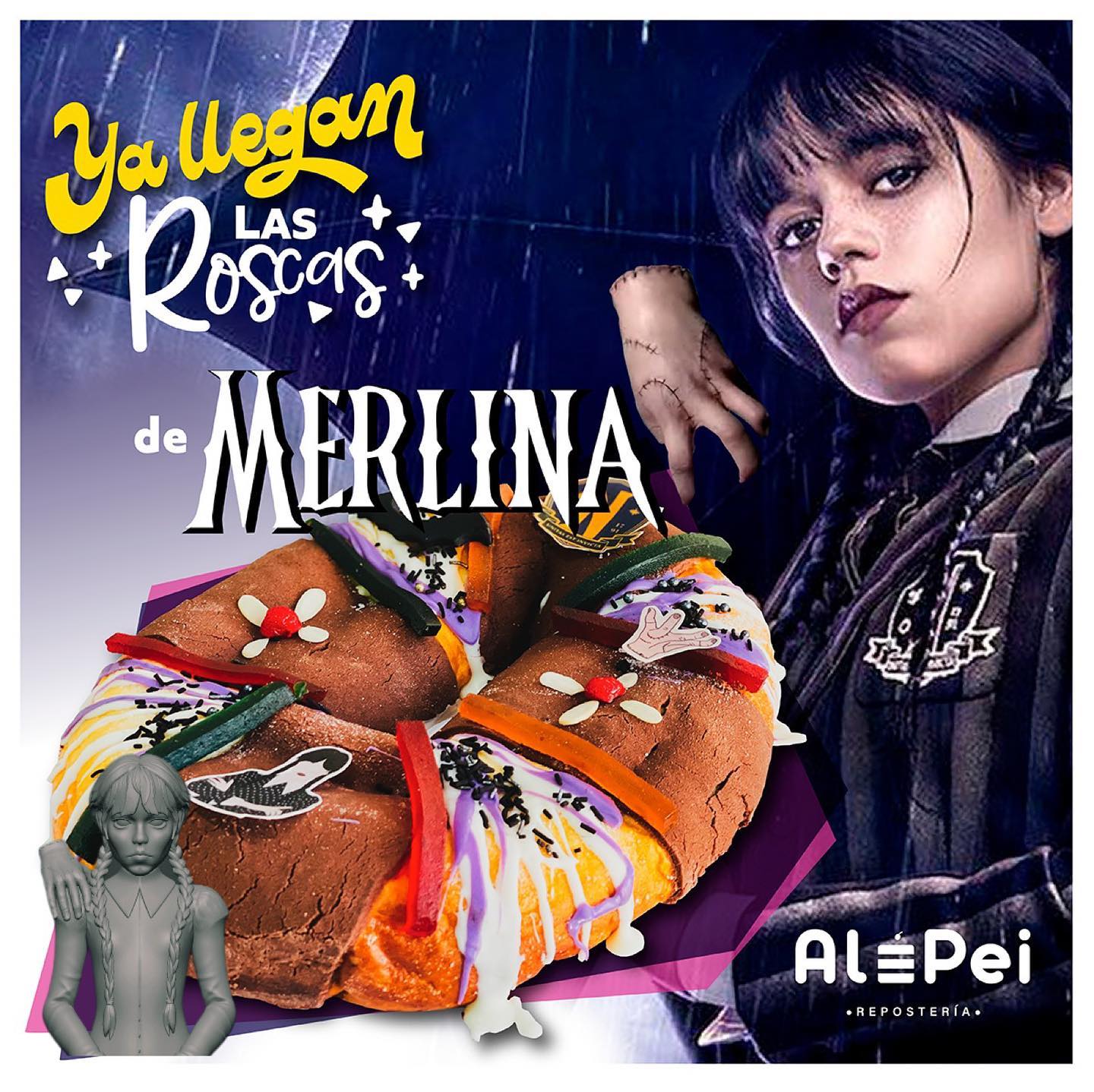Que consiste en una rosca con colores y decoraciones de Merlina, incluso si te sale el niño dios, en esta ocasión te saldría la fría expresión de Merlina ya que la figura que viene es del personaje de la serie, claro que las decoraciones también tienes algunas decoraciones tradicionales como el ate entre otras.