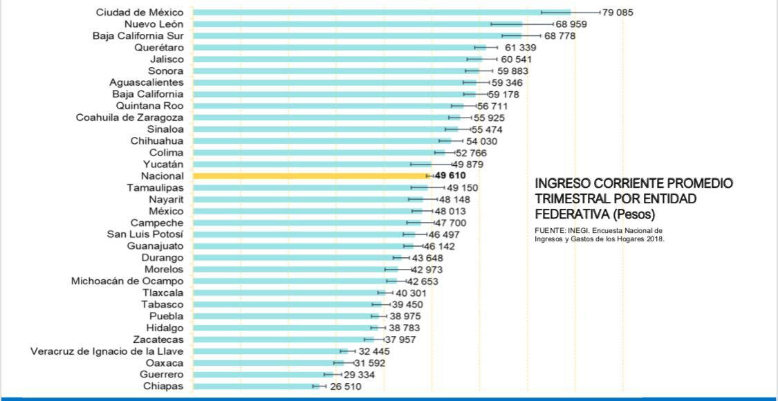 En la encuesta, la Ciudad de México es la que mayor ingreso registró, con 79 mil 085 pesos, mientras que Chiapas obtuvo el lugar 32 con 26 mil 510 pesos de ingreso trimestral.