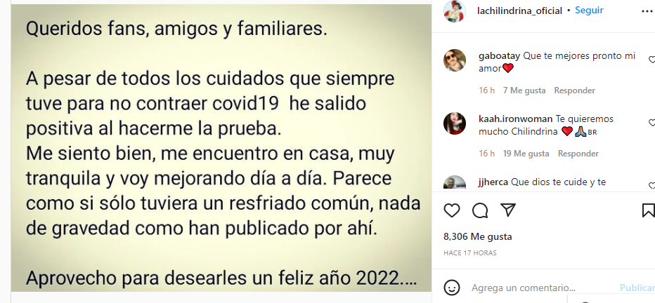“Queridos fans, amigos y familiares, a pesar de todos los cuidados que siempre tuve para no contraer Covid-19 he salido positiva al hacerme la prueba”, escribió en su red social
