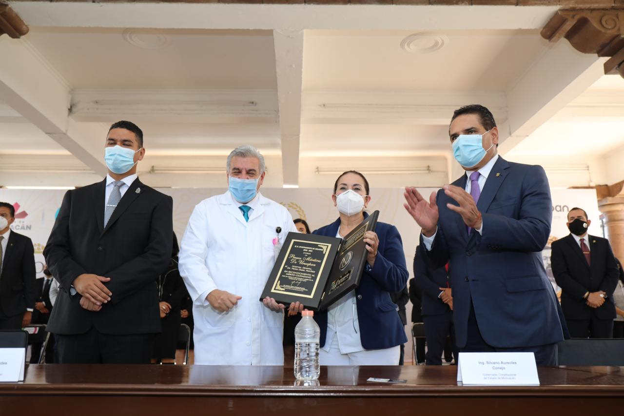 Uruapan, Michoacán, a 21 de octubre de 2020.- Por su incansable lucha en la primera línea de batalla contra el COVID-19, personal de la Secretaría de Salud, IMSS e ISSSTE recibieron la Presea Mártires de Uruapan.