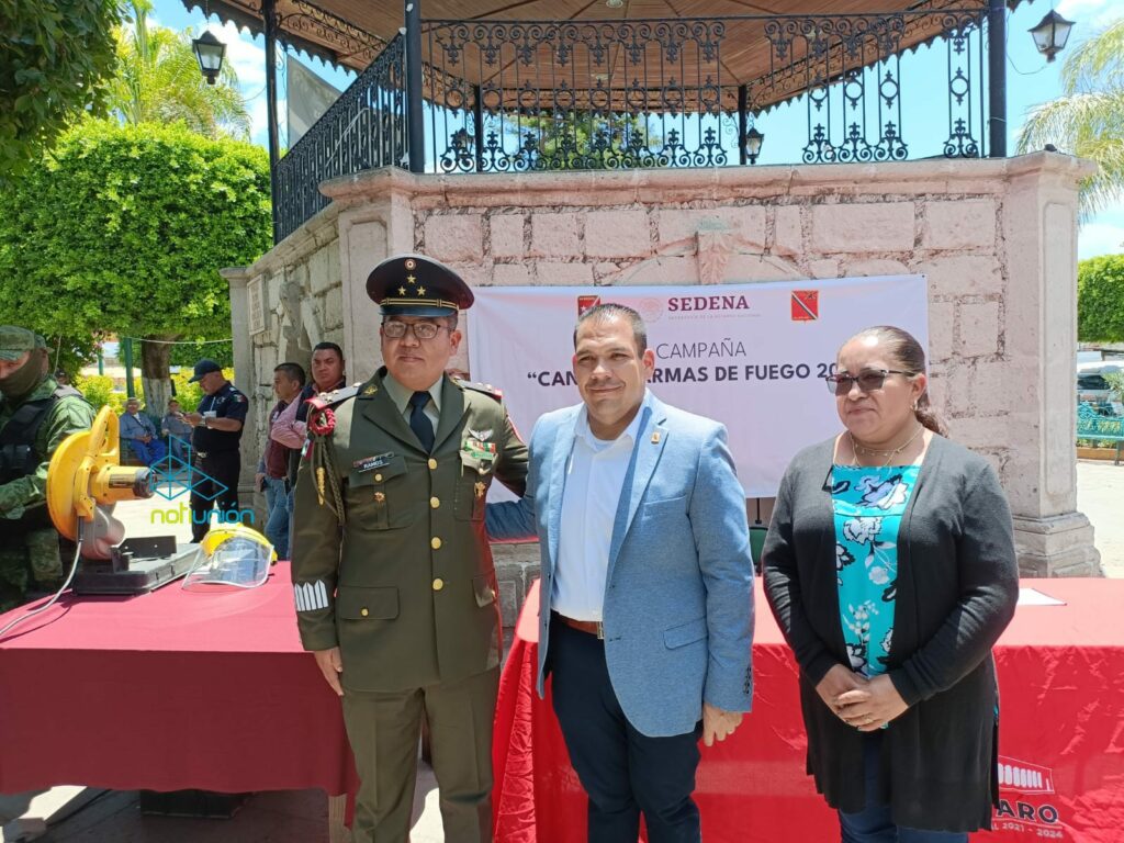 Tarímbaro, Michoacán, 11 de mayo de 2023.- Este jueves se llevó a cabo el arranque de la campaña de canje de armas en el municipio de Tarímbaro, encabezada por el presidente Bladimir González y la Secretaría de Defensa Nacional, representada por el Comandante del 12vo Batallón de Infantería, Edwin Rolando Campos.