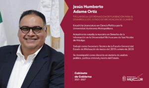 Morelia, Michoacán, 18 de enero de 2026.- Con el objetivo de consolidar la visión estratégica de la administración estatal, el gobernador Alfredo Ramírez Bedolla nombró a Jesús Humberto Adame Ortíz como titular de la Coordinación de Planeación para el Desarrollo del Estado (Cpladem).