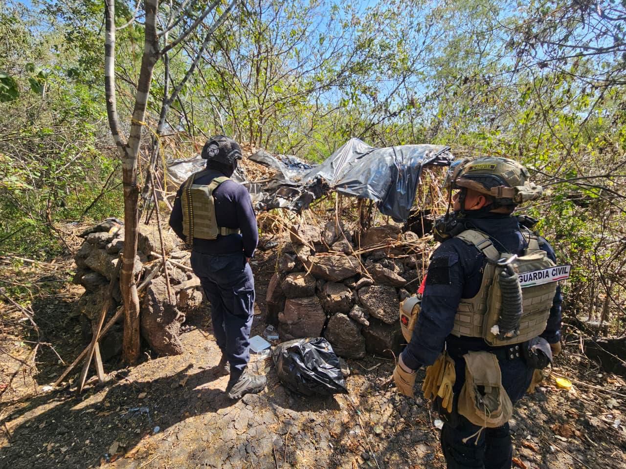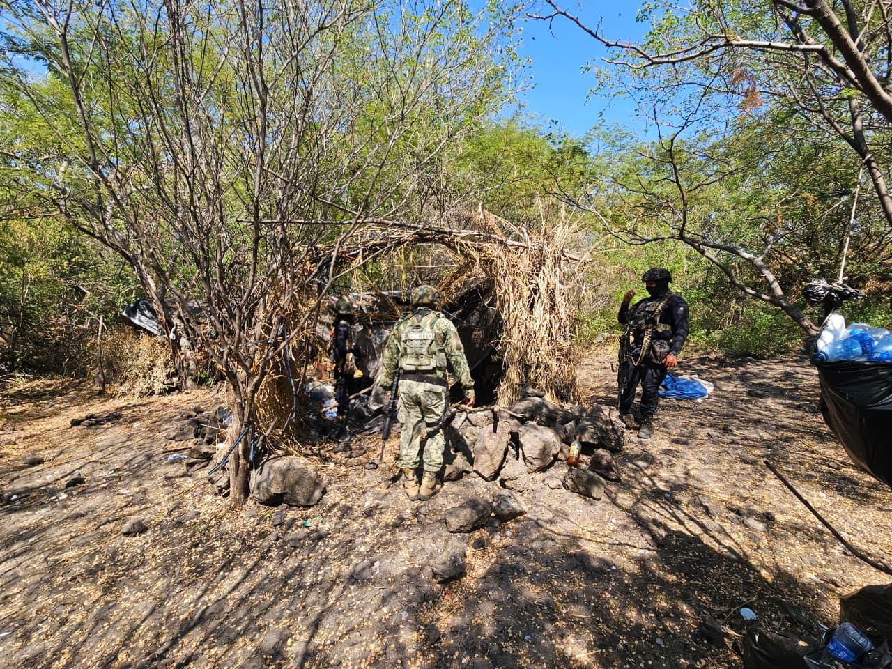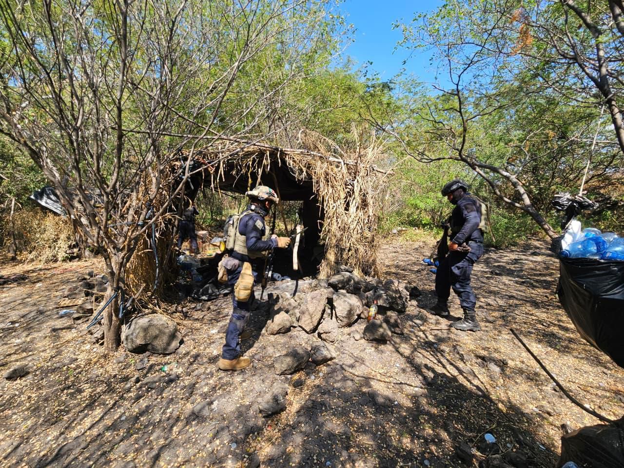 Buenavista, Michoacán, 8 de noviembre de 2025.- Elementos de las secretarías de Seguridad Pública (SSP) y de la Defensa Nacional (Defensa), localizaron e incineraron cuatro campamentos clandestinos presuntamente utilizados por grupos delictivos en el municipio de Buenavista.