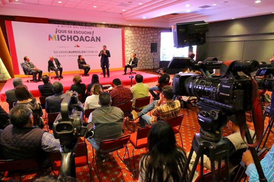 Morelia, Michoacán, a 28 de septiembre de 2018.- Titulares de las secretarías de Salud, Educación y Desarrollo Social y Humano, destacaron los avances alcanzados en estos primeros tres años de la administración del Gobernador Silvano Aureoles Conejo en sus respectivas áreas, y dialogaron con representantes de la sociedad civil y medios de comunicación en el panel-rueda de prensa ¡Que se escuche Michoacán! con el Gabinete Social.