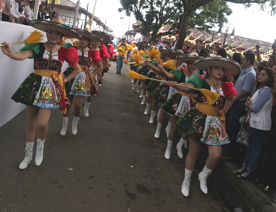Joviales y con peculiar estilo coreográfico, alumnas bastoneras del plantel Ario de Rosales, vistieron el desfile y acto inaugural de la tradicional Feria.