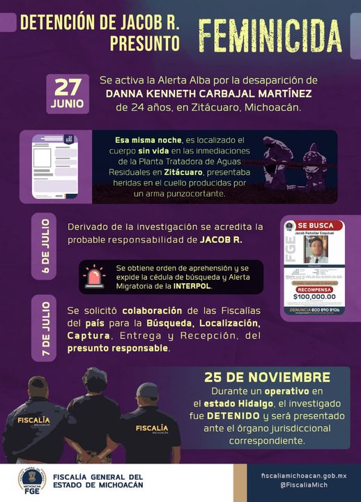 Morelia, Michoacán, a 25 de noviembre de 2021.- Resultado de trabajos de investigación realizados por la Fiscalía General del Estado de Michoacán (FGE) en coordinación con autoridades del estado de Hidalgo, fue detenido Jacob Rebollar Esquivel, por su posible relación en el feminicidio de Danna Kenneth C., ocurrido en el municipio de Zitácuaro.