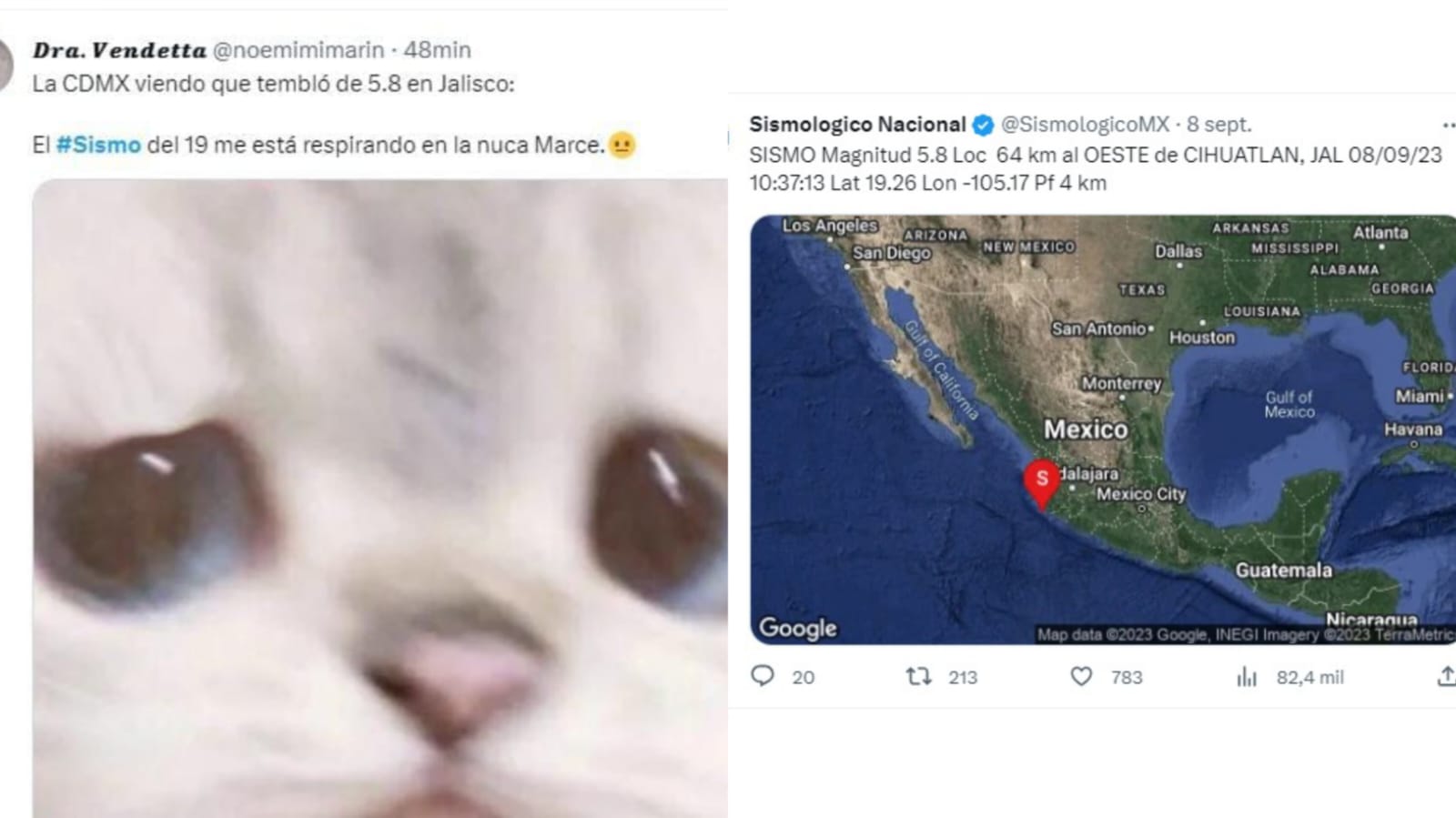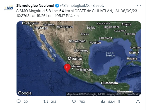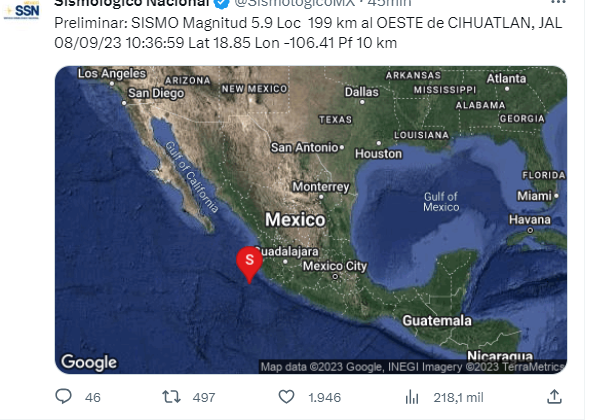 A 08 de septiembre del 2023.- El día de hoy viernes se registraron dos sismos en México, estos sucedieron en Cihuatlán, Jalisco, con una magnitud de 5.9 y 5.8 así lo dio a conocer el Sismológico Nacional.