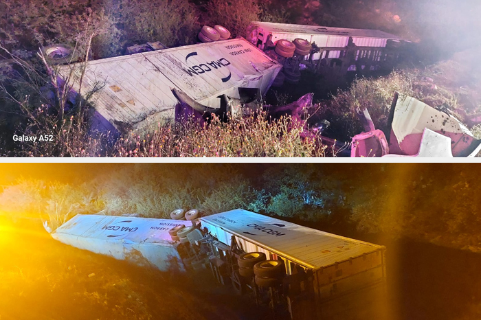 Horas más tarde, por la mañana, se registró un segundo accidente en el kilómetro 187, en el tramo Las Cañas – Cuatro Caminos. En este caso, un tractocamión con cabina de color guinda y dos remolques volcó, quedando entre la maleza a un costado de la vía.