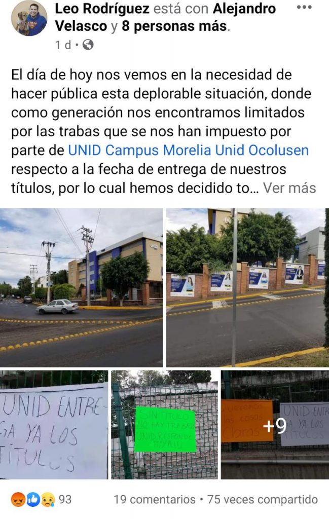 «Hace ya más de 2 años que egresamos y su única respuesta es que la SEP no está trabajando por pandemia, no obstante, otras universidades están entregando sus títulos, certificados y diplomados en tiempo y forma, por lo cual nos preguntamos, qué es lo que está pasando? Ante esta situación, los encargados, así como directivos han optado por esconderse, no contestar correos, no contestar el teléfono y no dejar acercarse a las personas que vayan a preguntar por su título, lo único que estamos pidiendo como egresados es que se le de solución a nuestra petición de que nos entreguen nuestro titulo de la forma más rápida posible, cabe mencionar que la entrega de documentación y el pago del título fue cubierto desde septiembre del 2019 (6 meses antes de la pandemia)», escribió en su cuenta de Facebook uno de los inconformes.