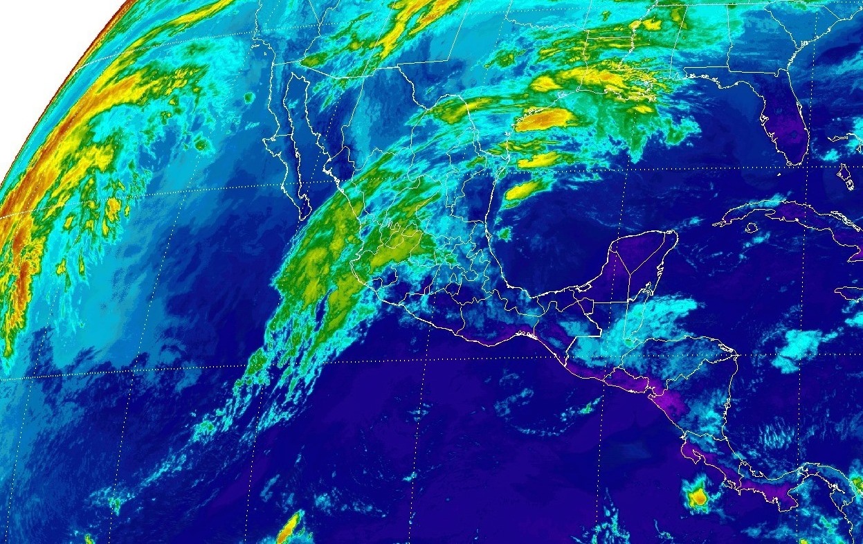 Pacífico Sur: Cielo nublado con tormentas puntuales muy fuertes, acompañadas de descargas eléctricas en Chiapas, fuertes en Oaxaca, así como intervalos de chubascos en Guerrero. Ambiente caluroso y evento de “Norte” con rachas de viento superiores a 70 km/h en el Istmo y Golfo de Tehuantepec.
