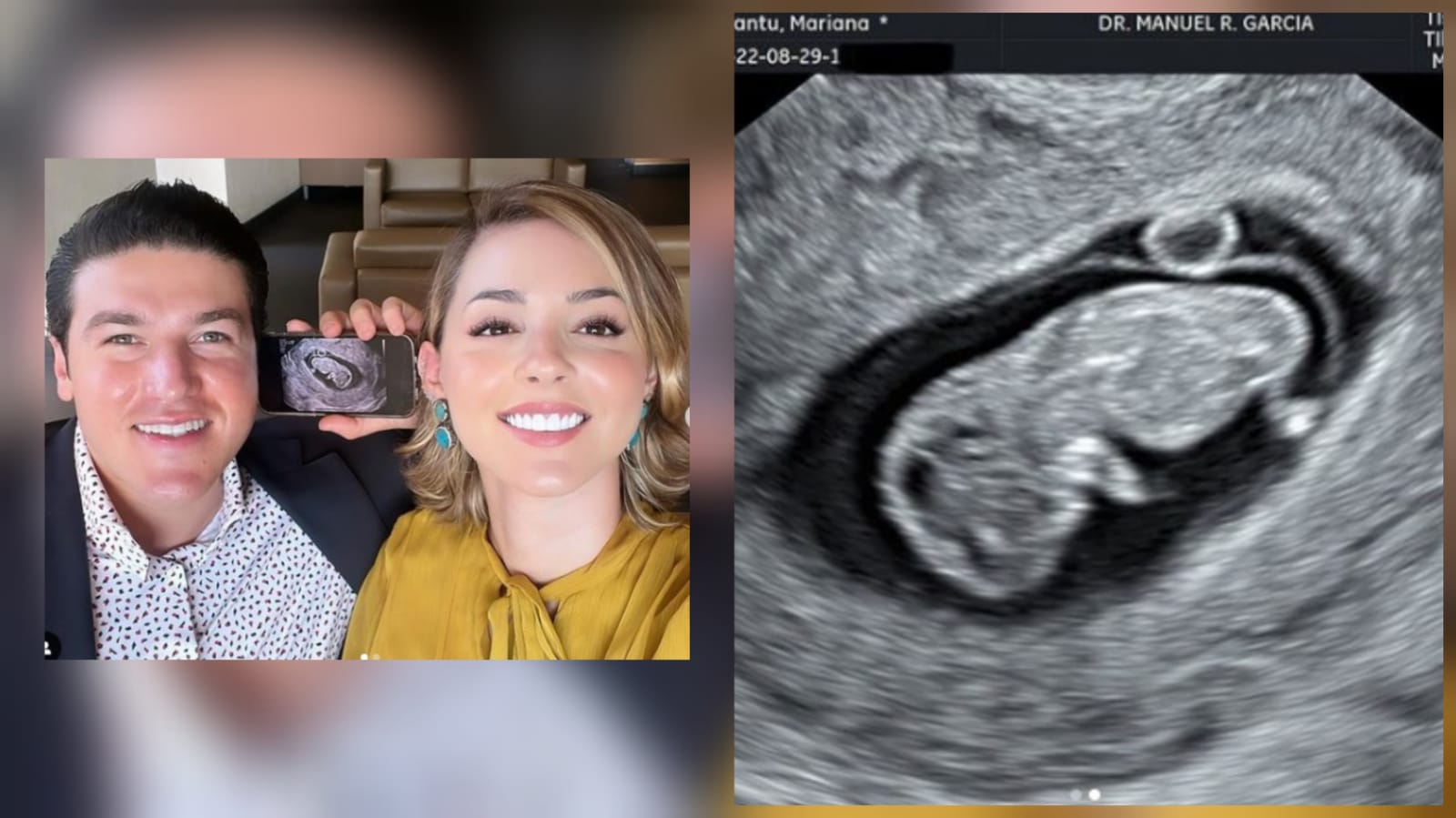 Donde se puede observar en el visual un par de fotos una donde aparecen los dos de los mas sonrientes junto a la foto del ultrasonido de su pequeño y otra de solo la imagen de su primogénito.