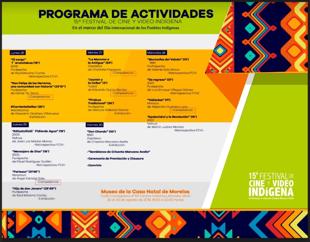 Cabe mencionar que el interés para participar en el festival ha crecido, este año serán 13 los materiales que se proyectarán a lo largo de la semana, entre los que destacan títulos como “Jazmín y la Ceiba”, “Don Chendo”, “Pirekua Tradicional”, entre otros. Posterior a las presentaciones se abrirá una mesa de expertos que analizarán los contenidos temáticos de los videos.