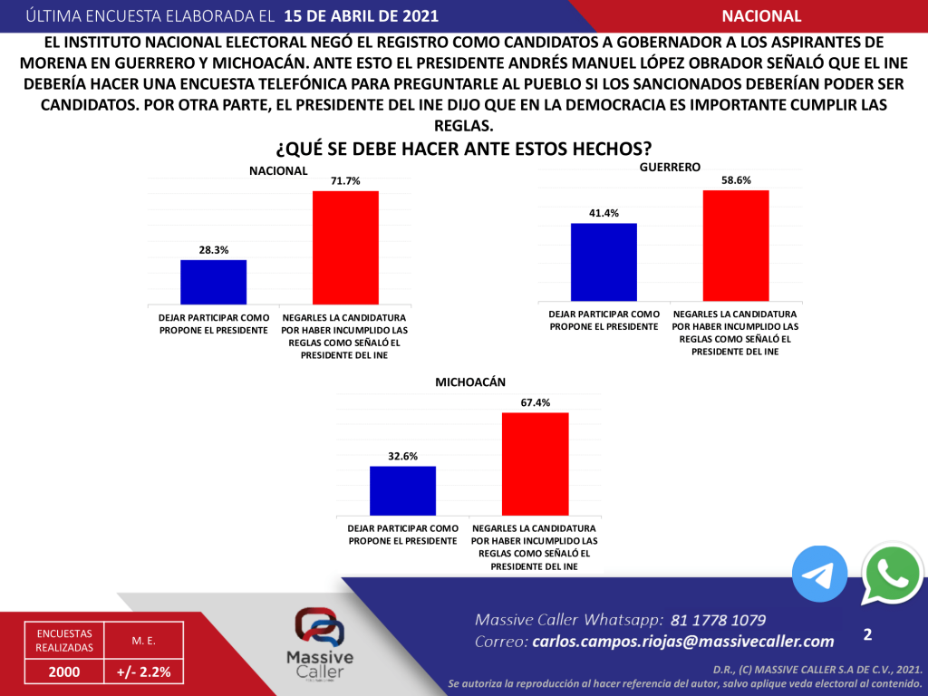 Ante ello Massive Caller preguntó a la sociedad mexicana si estaban de acuerdo en qué se les permitiera a Félix Salgado Macedonio y Raúl Morón Orozco ser candidatos a la gubernatura de Guerrero y Michoacán o si apoyaban la decisión del respetar las reglas tal y como lo propuso el presidente del INE.