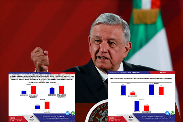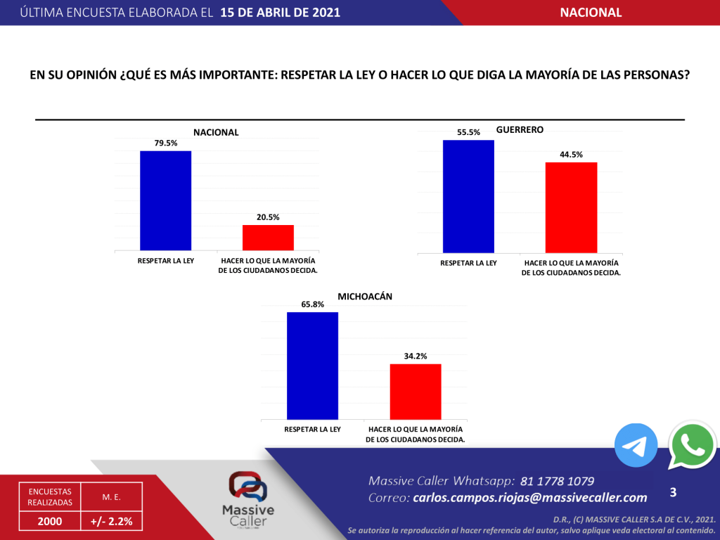 Además se cuestionó a los mexicanos sobre si estaban de acuerdo en respetar la ley o en hacer lo que digan los ciudadanos tal y como lo propone el presidente de México Andrés Manuel López Obrador. Ante tal cuestionamiento las encuestas fueron favorables en cumplir la ley tanto a nivel nacional como en los estados de Guerrero y Michoacán.