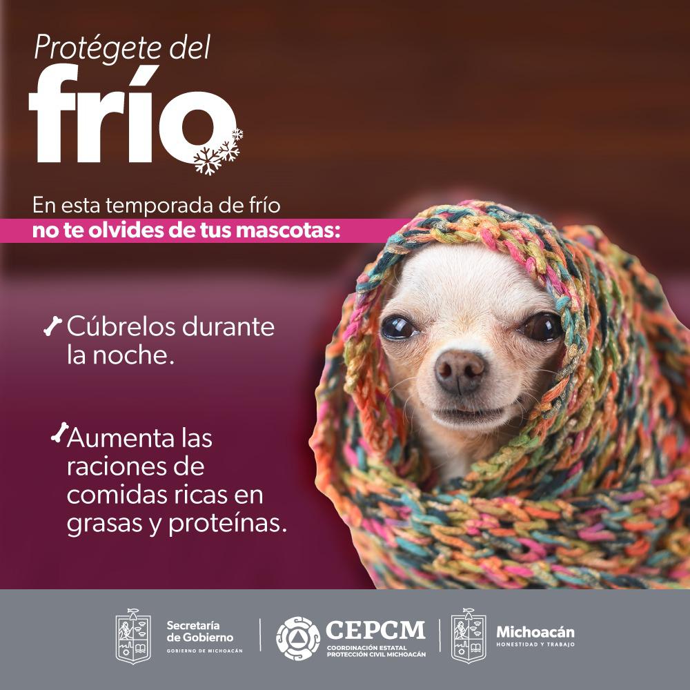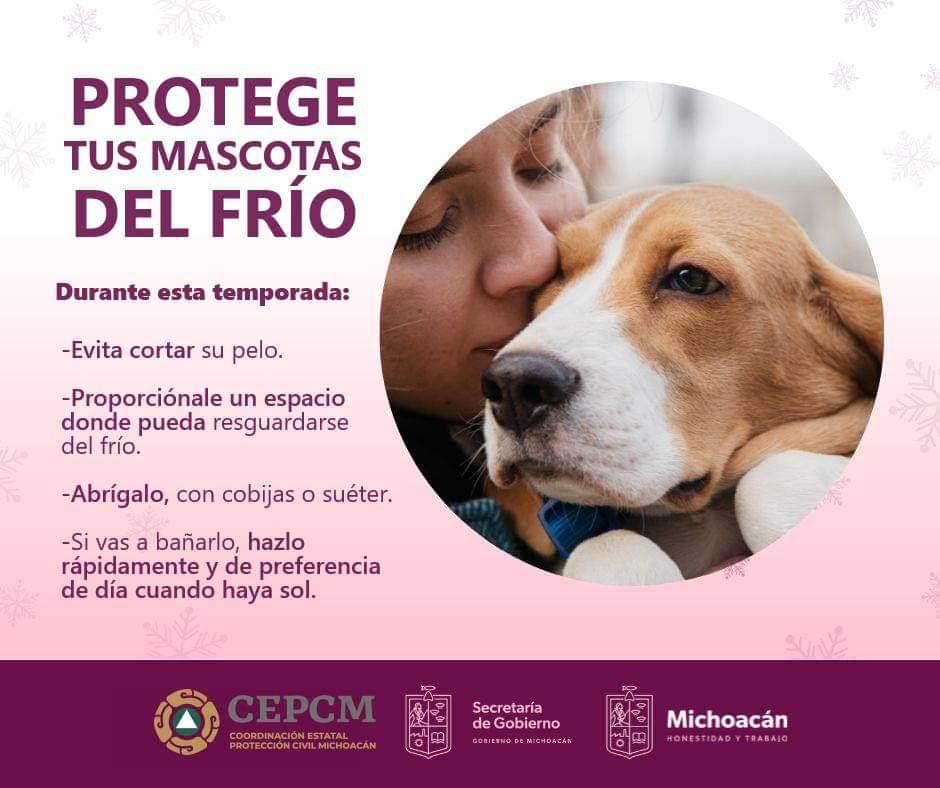 Morelia, Michoacán, 18 de diciembre de 2023.- Con las temperaturas mínimas que se registran en Michoacán, la Secretaría de Gobierno, a través de la Coordinación Estatal de Protección Civil, exhorta a la población a resguardar del frío a sus mascotas.