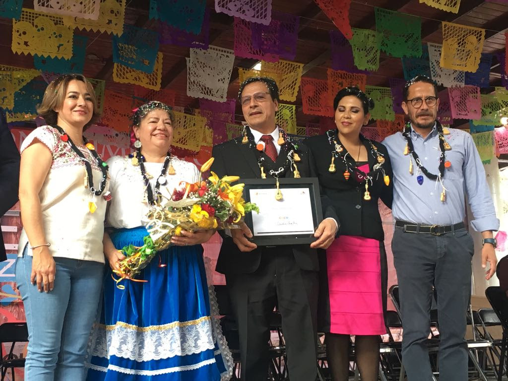 Paracho, Michoacán, a 19 de febrero de 2018.- Con la representación del Gobernador Silvano Aureoles Conejo, la titular de la Secretaría de Turismo (Sectur) estatal, Claudia Chávez López, entregó el reconocimiento a Germán Vázquez Rubio, creador de la guitarra de la película «Coco».