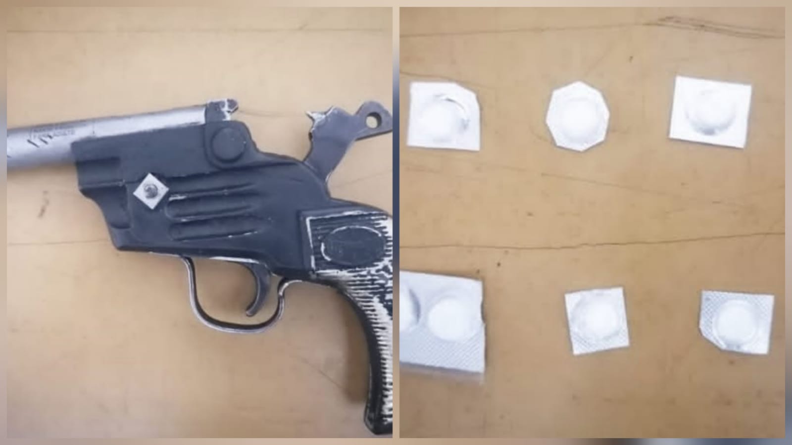 Tras la inspección, fueron localizadas entre sus pertenencias pastillas de clonazepam, de inmediato, el hombre junto al arma calibre .22 milímetros, y el medicamento; fueron asegurados y puestos a disposición de la autoridad competente a efecto de definir su situación jurídica conforme a Derecho.