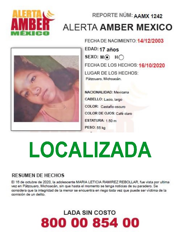 De las investigaciones se desprende que, el pasado 16 de octubre, María Leticia R.R., de 17 años de edad, fue vista por última vez en el municipio de Pátzcuaro, sin que hasta ese momento se tuviera más información de su paradero.