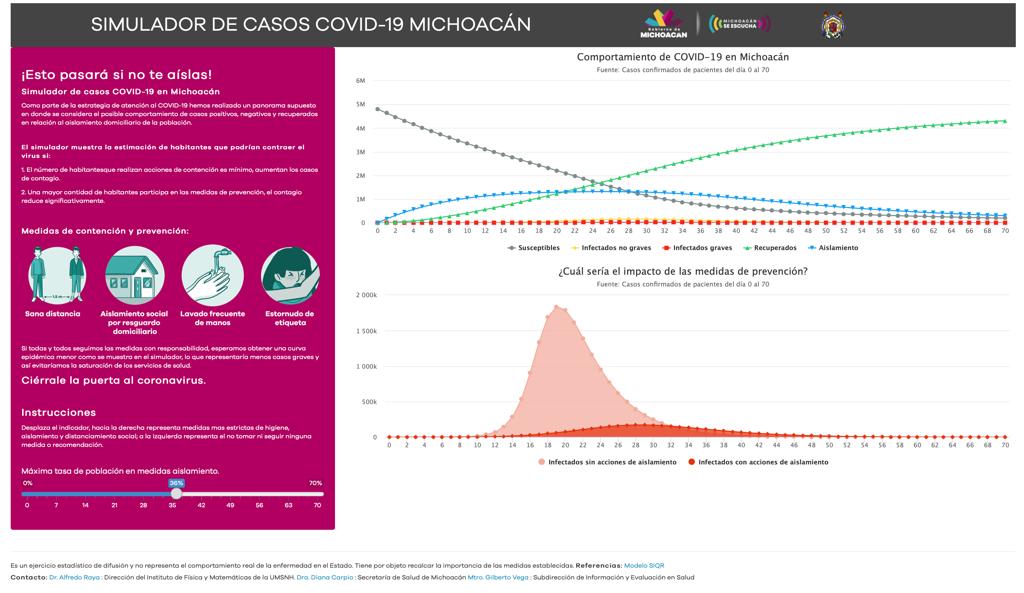 Toda la población podrá hacer uso del mismo, accediendo al simulador que ya está disponible en el micrositio http://michoacancoronavirus.com/ que fue creado por el Gobierno del Estado para mantener informada a la población sobre las medidas preventivas y acciones emprendidas en esta contingencia.