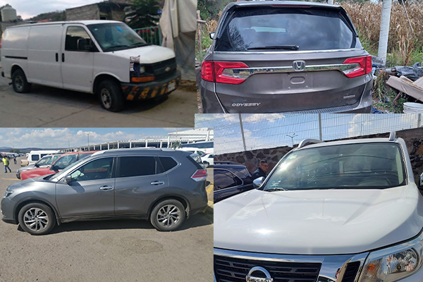 Durante esta acción se aseguraron cuatro camionetas, dos Nissan, una de la línea X-Trail, color gris y una de la línea NP 300 tipo Pickup color blanco; otra de la marca Chevrolet, línea Exprés color blanco; además una Honda, línea Odyssey tipo minivan, las cuales contaban con reporte de robo, cometidos con violencia.
