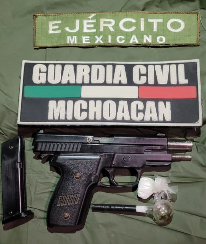 Uruapan, Michoacán, 25 de abril del 2023.- Los trabajos operativos para garantizar la paz y el orden público en el municipio de Uruapan, efectuados por la Secretaría de Seguridad Pública (SSP), permitieron la detención de una persona del sexo masculino, en posesión de una réplica de arma de fuego y de sustancia granulosa, con las características de la metanfetamina.