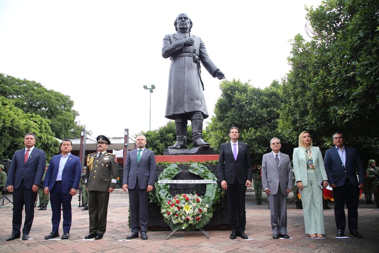 Es así que para honrar su nombre y legado, en presencia del Gobernador, Alfredo Ramírez Bedolla, autoridades municipales, estatales y federales, el alcalde, Alfonso Martínez, también entonó el Himno Nacional y llevó a cabo el depósito de ofrenda floral en el monumento al Padre de la Patria.