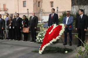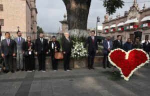 Morelia, Michoacán, 15 de septiembre de 2025.- El gobernador Alfredo Ramírez Bedolla encabezó el izamiento de la Bandera Nacional a media asta y el depósito de la ofrenda floral, en memoria de las víctimas de los atentados del 15 de septiembre de 2008, en Morelia.