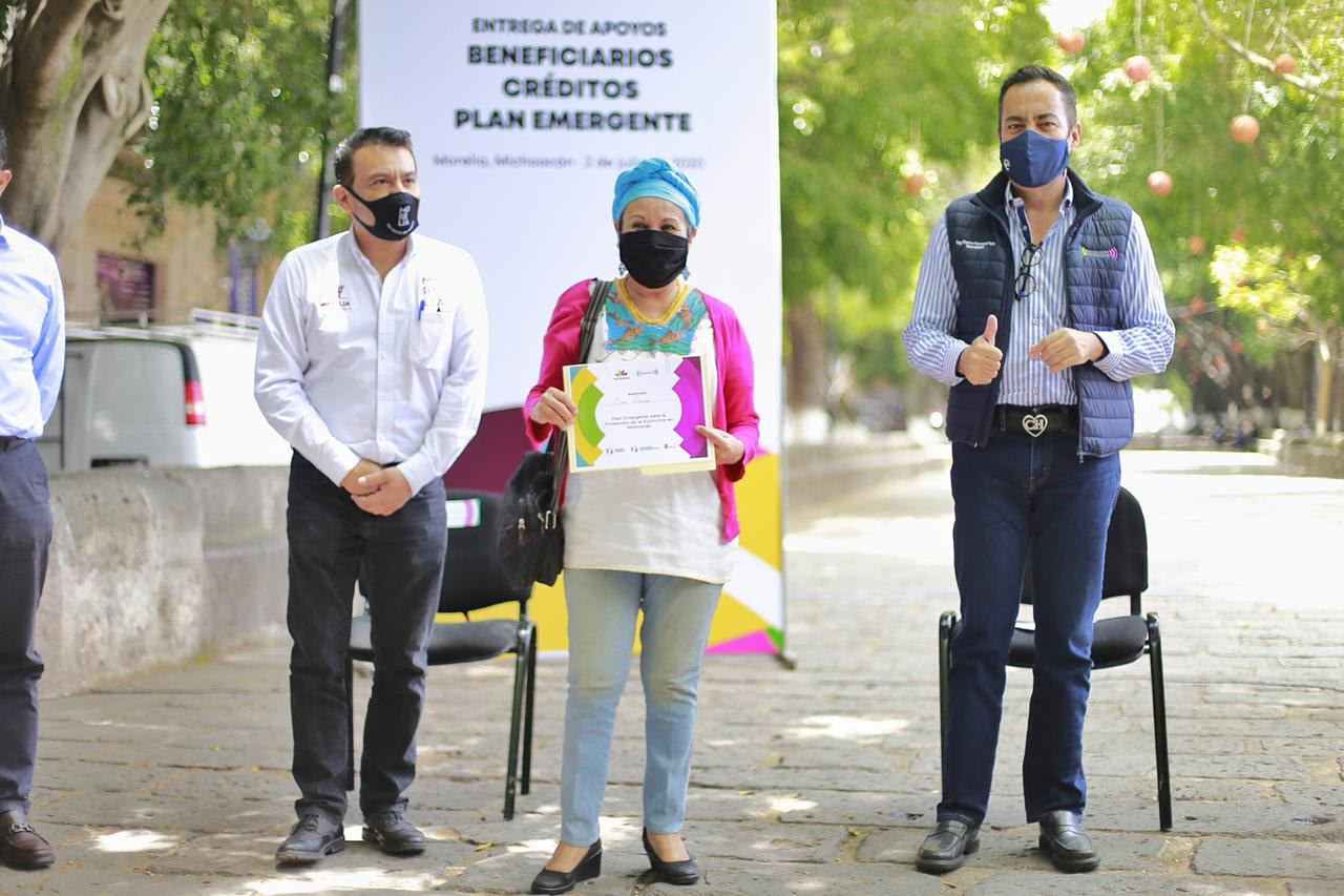 Morelia, Michoacán, 2 de julio de 2020.- Un total de 127 créditos por más de un millón de pesos fueron entregados este día a beneficiarios de negocios de actividades comerciales y de servicios del municipio de Morelia, como parte del Plan Emergente que el Gobierno del Estado de Michoacán puso en marcha en apoyo a la economía.