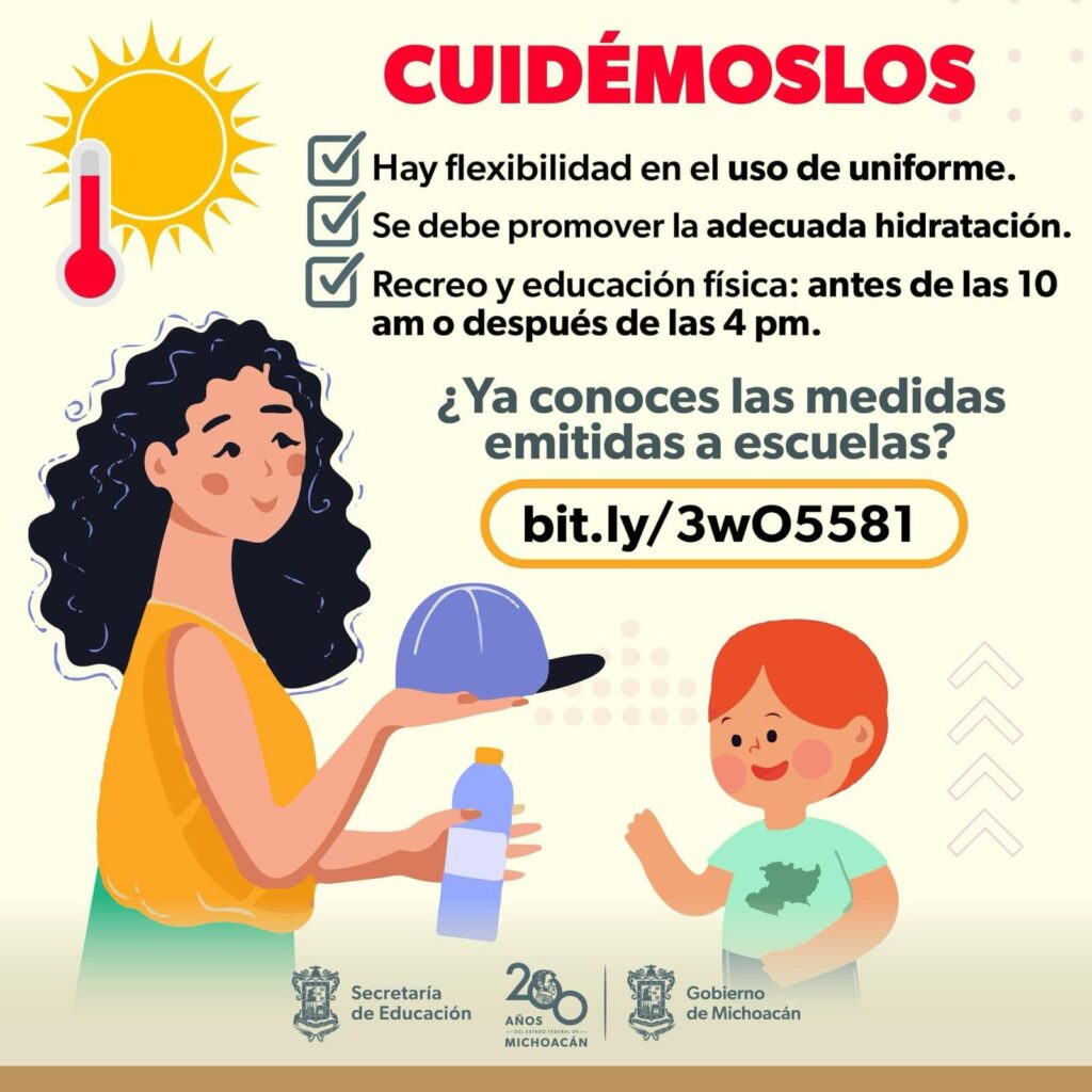 Morelia, Michoacán, 30 de mayo de 2024.- Con el objetivo de velar por la salud y bienestar de las y los estudiantes durante esta época de calor, la Secretaría de Educación del Estado (SEE) comparte con docentes y toda la comunidad escolar algunas de las más recientes recomendaciones para prevenir afectaciones por las altas temperaturas, en la circular disponible para descarga en el link https://bit.ly/443V2be.