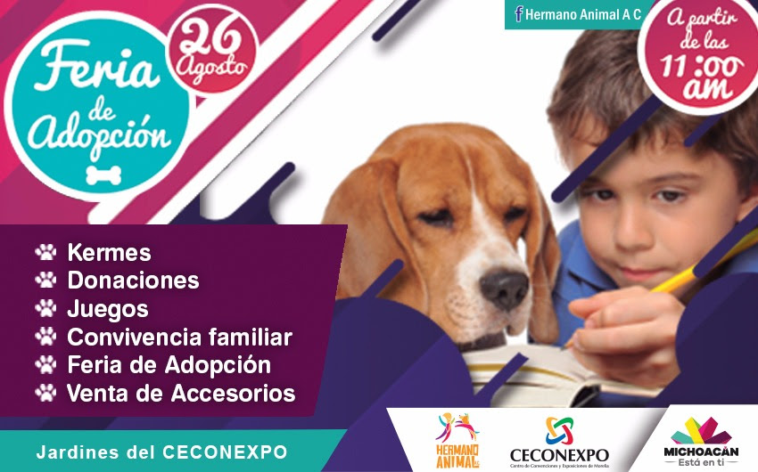Morelia, Michoacán, a 22 de agosto de 2018.- Con el objetivo de fomentar la adopción de animales rescatados de situación de calle, este domingo 26 de agosto se realizará una Jornada de Adopción de las 11:00 a las 16:00 horas en los jardines del Centro de Convenciones y Exposiciones de Morelia (Ceconexpo).