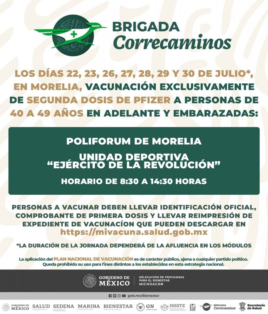 Morelia, Michoacán a 21 de julio del 2021.- Este jueves inicia la aplicación de la segunda dosis de Pfizer-BioNTech a personas de 40 a 49 años y embarazadas en la capital michoacana, así lo dio a conocer la Delegación Bienestar Michoacán a través de sus redes sociales oficiales.