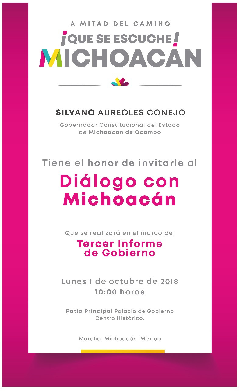 “A mitad del camino, queremos que se escuche en todas partes, ¡Que se escuche Michoacán!”, fue lo comentado por el Gobernador, al instruir la realización de este esquema de diálogo y retroalimentación, en el marco de su Tercer Informe de Gobierno.