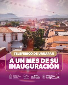 Morelia, Michoacán, 18 de marzo 2026.- Estamos exactamente a un mes de que se inaugure el teleférico de Uruapan, que se proyecta para el próximo 18 de abril, a partir de dicha fecha este sistema de transporte comenzará a ofrecer viajes seguros, rápidos e inclusivos a más de 118 mil usuarias y usuarios, informó la secretaria de Desarrollo Urbano y Movilidad, Gladyz Butanda Macías.