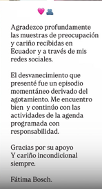 En el comunicado, Bosch señaló que actualmente se encuentra en buen estado y que continuará con sus compromisos profesionales conforme a su agenda programada, reiterando su agradecimiento por el cariño y la preocupación mostrada por el público.