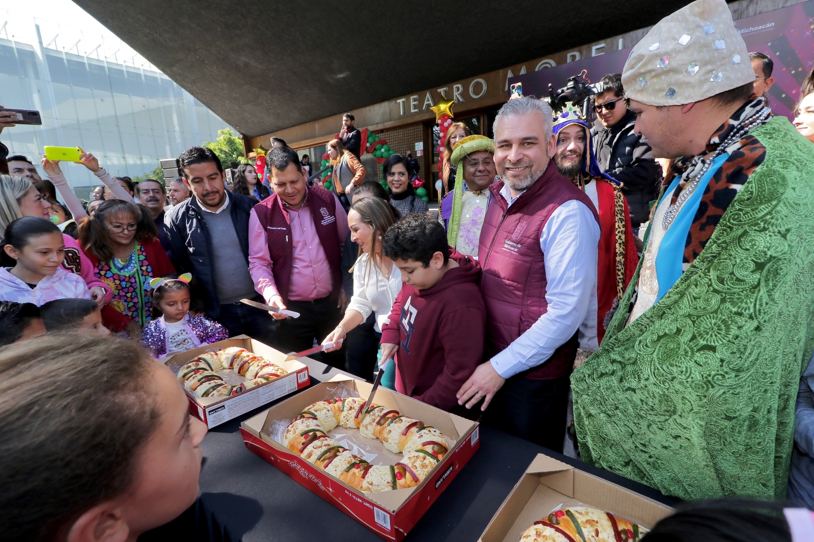 Morelia, Michoacán, 6 de enero del 2023.- El gobernador Alfredo Ramírez Bedolla, acompañado de su esposa Grisel Tello Pimentel, presidenta honoraria del Sistema DIF Michoacán, festejó junto con cientos de niños el Día de los de Reyes Magos.