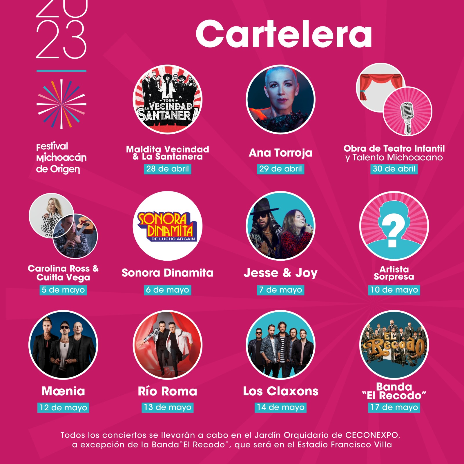 Todos los conciertos con acceso libre, se realizarán en el Jardín del Orquidario del Centro de Convenciones y Exposiciones de Morelia (Ceconexpo), a partir de las 7:30 de la noche, a excepción del masivo que estará a cargo de El Recodo, que será en el Estadio de Béisbol Francisco Villa.