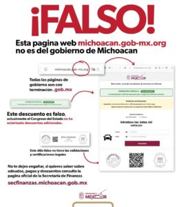 Morelia, Michoacán, 24 de enero de 2026.- Ante el incremento de páginas que en redes sociales ofrecen descuentos y promociones en refrendos, licencias de conducir y diversos trámites vehiculares, la Secretaría de Finanzas y Administración, a través del Servicio de Administración Tributaria de Michoacán (Satmich), alerta a la población para que no se víctima de engaños y fraudes.