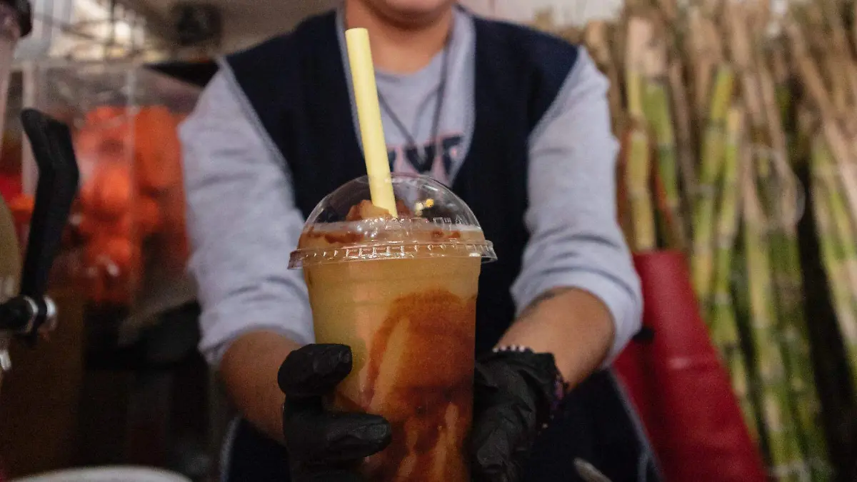 Entre los numerosos puestos instalados a las afueras del Santuario de la Virgen de Guadalupe, destaca Cañaveral de Pasiones, negocio atendido por Verónica Yuriko Arteaga, donde se prepara este frappé a base de jugo de caña recién extraído y combinado con frutas como maracuyá o naranja.