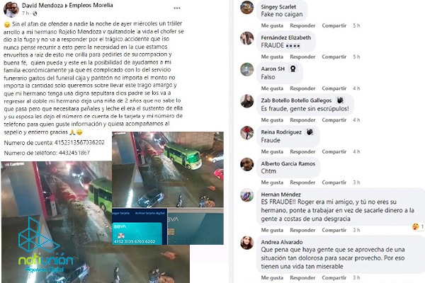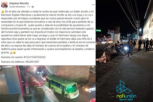 Morelia, Michoacán a 03 de febrero del 2022.-Por medio de diversos grupos de Facebook un perfil bajo el nombre de David Mendoza realizó una serie de posteos donde solicita apoyo económico para gastos funerarios de Rogelio Mendoza, mismo que perdió la vida mientras conducía su m motocicleta al ser arrollado por un tráiler que se quedó sin frenos en la salida a Mil Cumbres la noche de ayer.