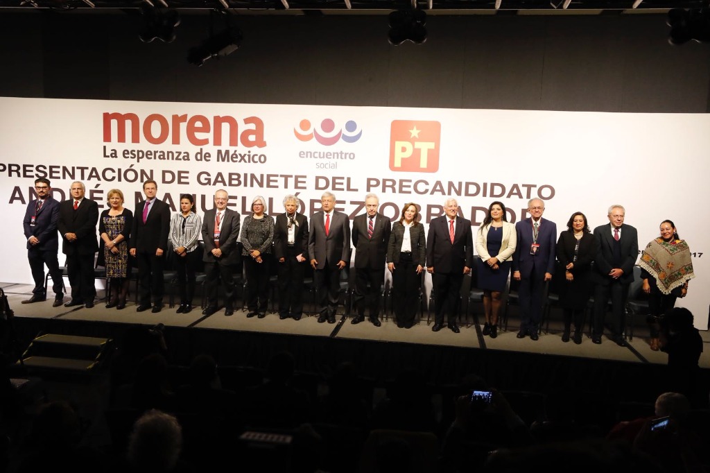El precandidato de Morena, Andrés Manuel López Obrador, presentó este jueves, primer día de precampañas presidenciales, al gabinete que le acompañaría en caso de ganar la Presidencia de la República en 2018.