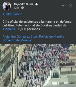 Mientras que la propia SSP reveló imágenes con pocas personas en la plaza Melchor Ocampo en la que se lograron contabilizar un aproximado de mil 200 asistentes; por otro lado, Alejandro González Cussi, comisionado de seguridad pública en Morelia, publicó un video en su cuenta oficial de Facebook, en el que informó un aproximado de 30 mil manifestantes en la capital michoacana.