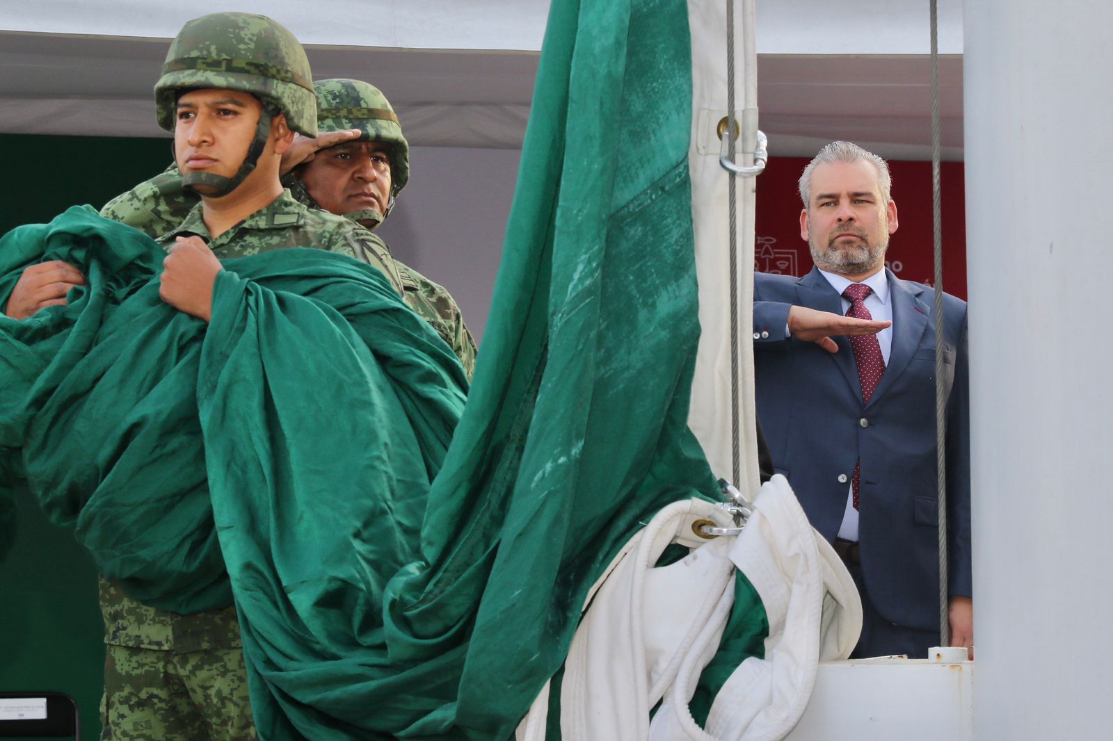 Morelia, Michoacán a 24 de enero del 2023.- En conmemoración del 202 aniversario del «Día de la Bandera de México», el gobernador de Michoacán, Alfredo Ramírez Bedolla, lideró el acto oficial en la capital del estado.