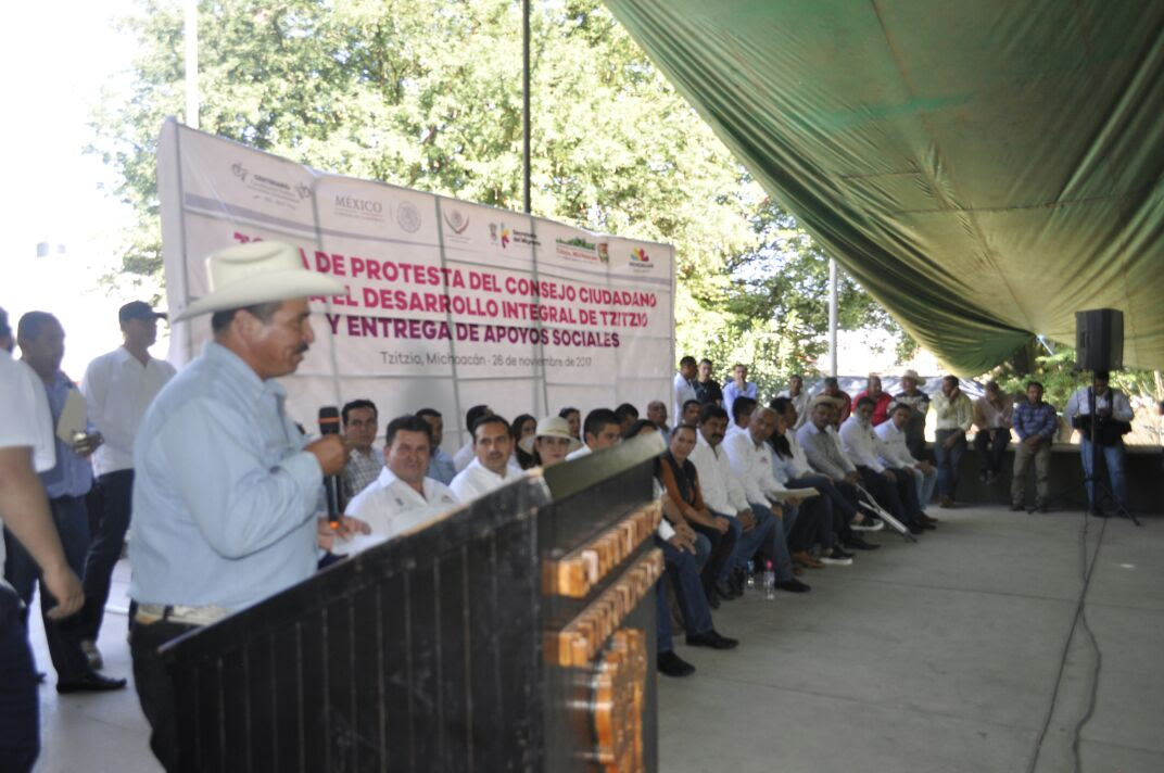 Tzitzio, Michoacán, a 27 de noviembre de 2017.- El titular de la Secretaría del Migrante (Semigrante), José Luis Gutiérrez Pérez, tomó protesta a las y los consejeros de Infraestructura, Desarrollo Económico, Medio Ambiente, Desarrollo Social y Seguridad del Consejo Ciudadano para el Desarrollo Integral del municipio de Tzitzio.