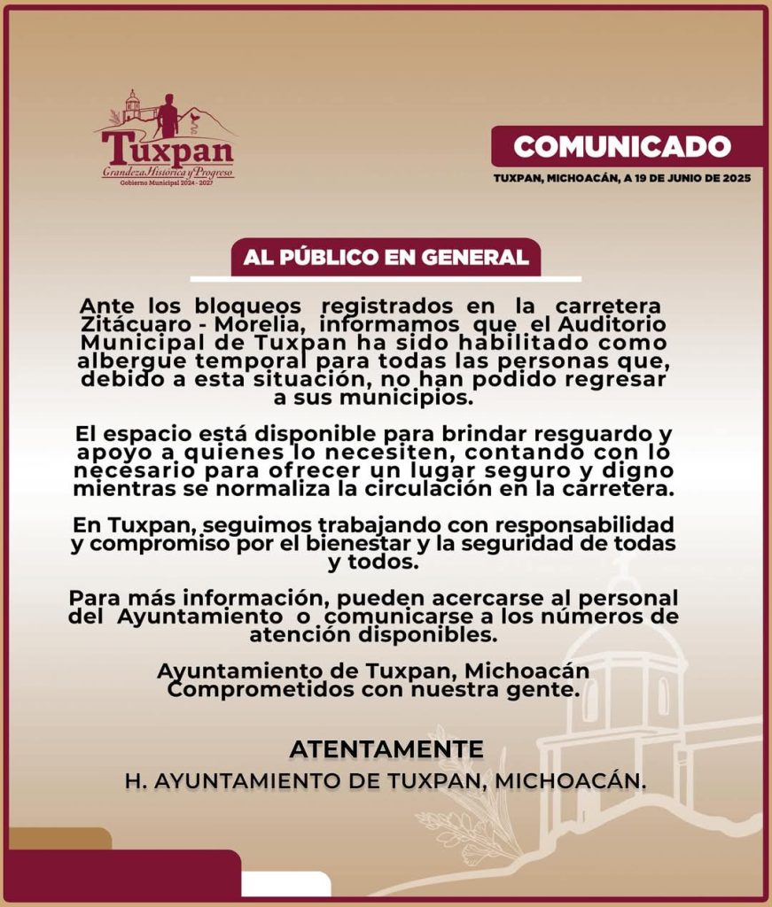 Por su parte, el Ayuntamiento de Tuxpan también anunció la habilitación del Auditorio Municipal como albergue temporal, con el objetivo de brindar apoyo a las personas afectadas por la situación de inseguridad y los bloqueos que impiden el paso hacia los municipios cercanos.
