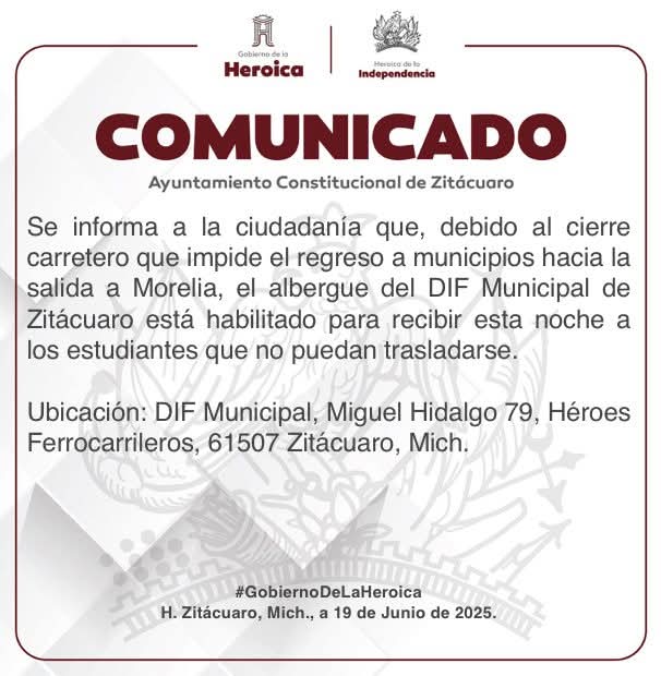 “El albergue del DIF Municipal de Zitácuaro está habilitado para recibir esta noche a estudiantes que no puedan trasladarse”, señaló el comunicado. El espacio se encuentra ubicado en la calle Miguel Hidalgo #79, en la colonia Héroes Ferrocarrileros.
