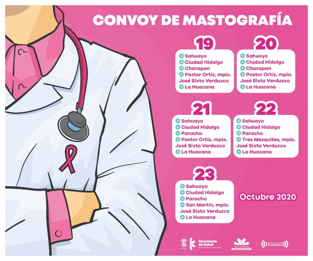 El servicio gratuito para las mujeres de 40 a 69 años, se estará brindado del 19 al 23 de octubre en Sahuayo, Ciudad Hidalgo y La Huacana, así como en las comunidades de Pastor Ortiz (19-21), Tres Mezquites (22) y San Martín (23) pertenecientes al municipio de José Sixto Verduzco. En Charapan del 19 al 21 y Paracho 22 y 23.