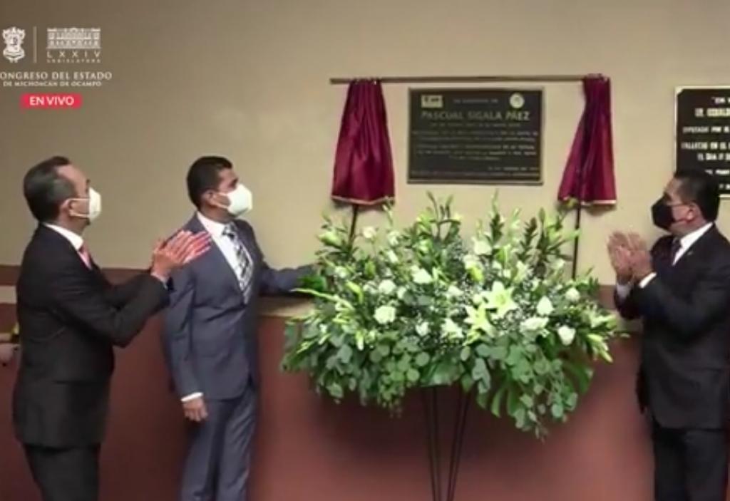 En honor y como regalo de cumpleaños a Sígala Páez se realizó la develación de la placa conmemorativa, misma que estuvo a cargo del presidente de la Mesa Directiva, Octavio Ocampo Córdova y el gobernador de Michoacán Silvano Aureoles Conejo.