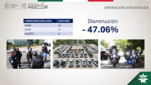 Detalló que durante los últimos meses, la incidencia de homicidios dolosos ha mostrado una tendencia a la baja. En junio se presentaron 15, en julio 17 y en agosto 9, como resultado de la Operación Apatzingán, donde participan las secretarías de Seguridad Pública (SSP) y de la Defensa Nacional (Sedena), así como de la Fiscalía General del Estado (FGE) con labores terrestres y aéreas.